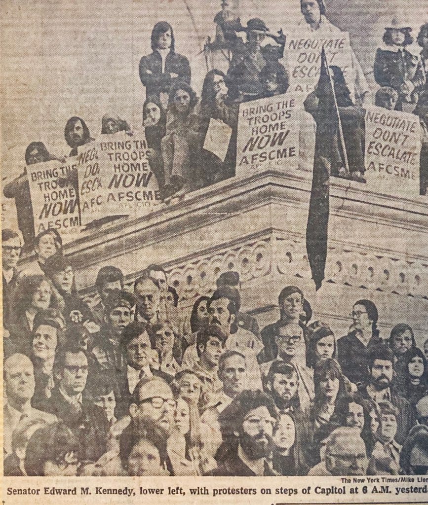 In case you are wondering, the answer is yes. That would be me in both photos below. First, standing two rows in front of Sen. Ted Kennedy who died in 2009; and second, helping to hold up the "Stop the War" sign.